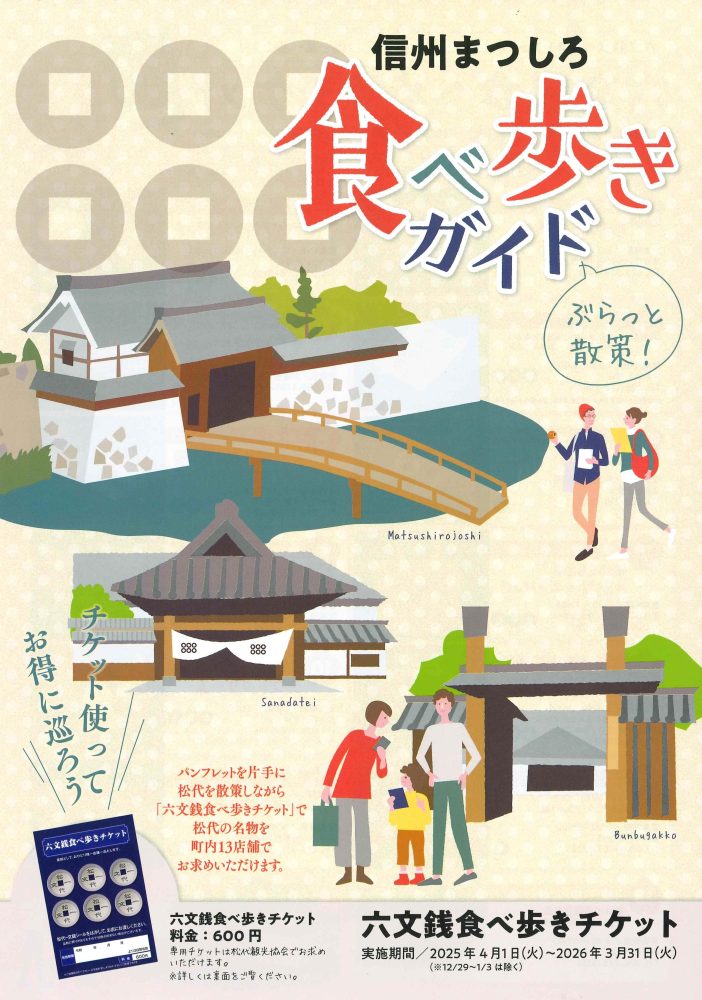 「六文銭食べ歩きチケット」がセットになった、まち歩きにピッタリのプランです。